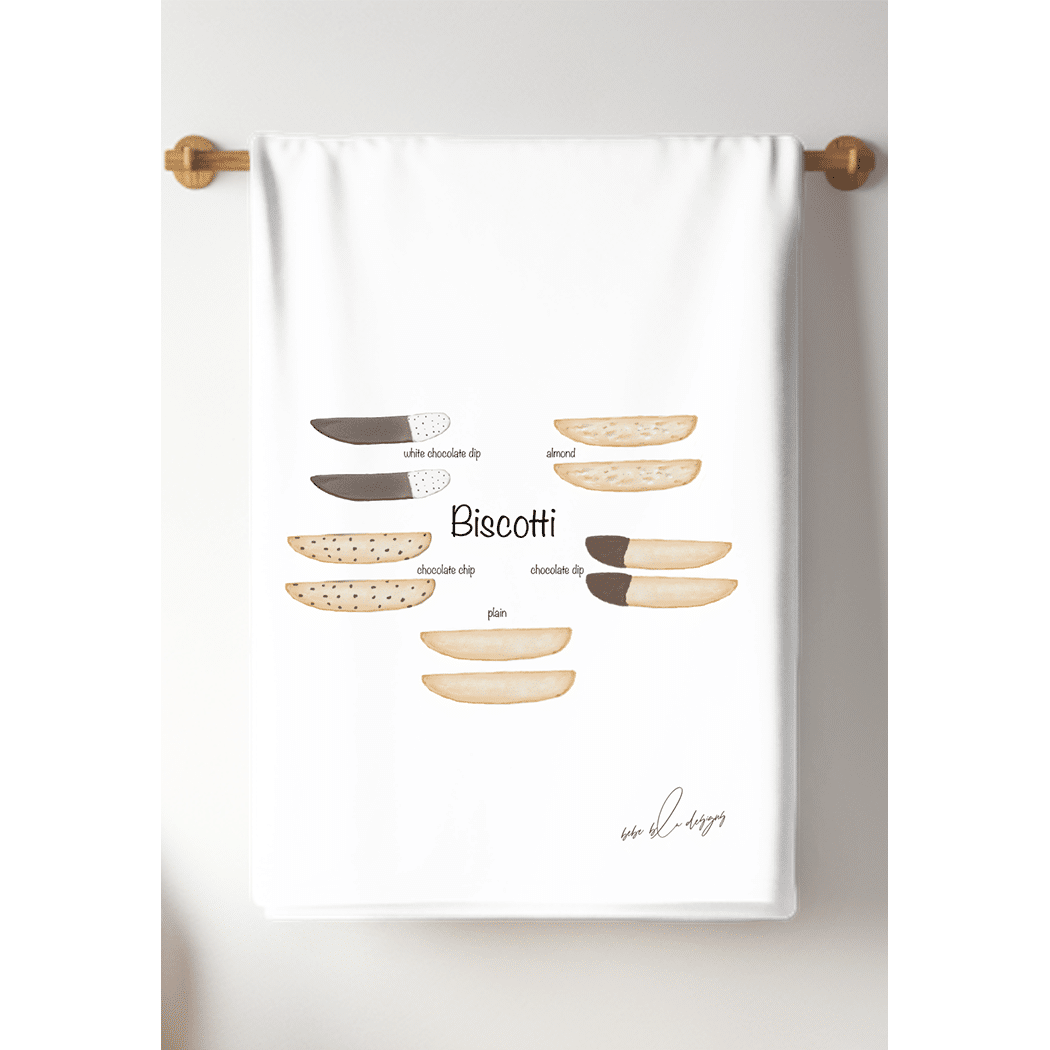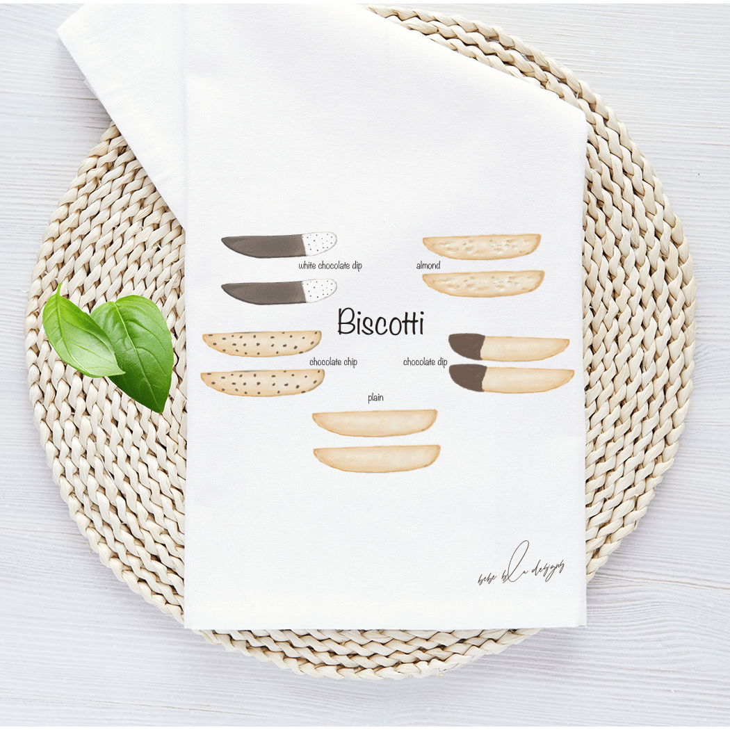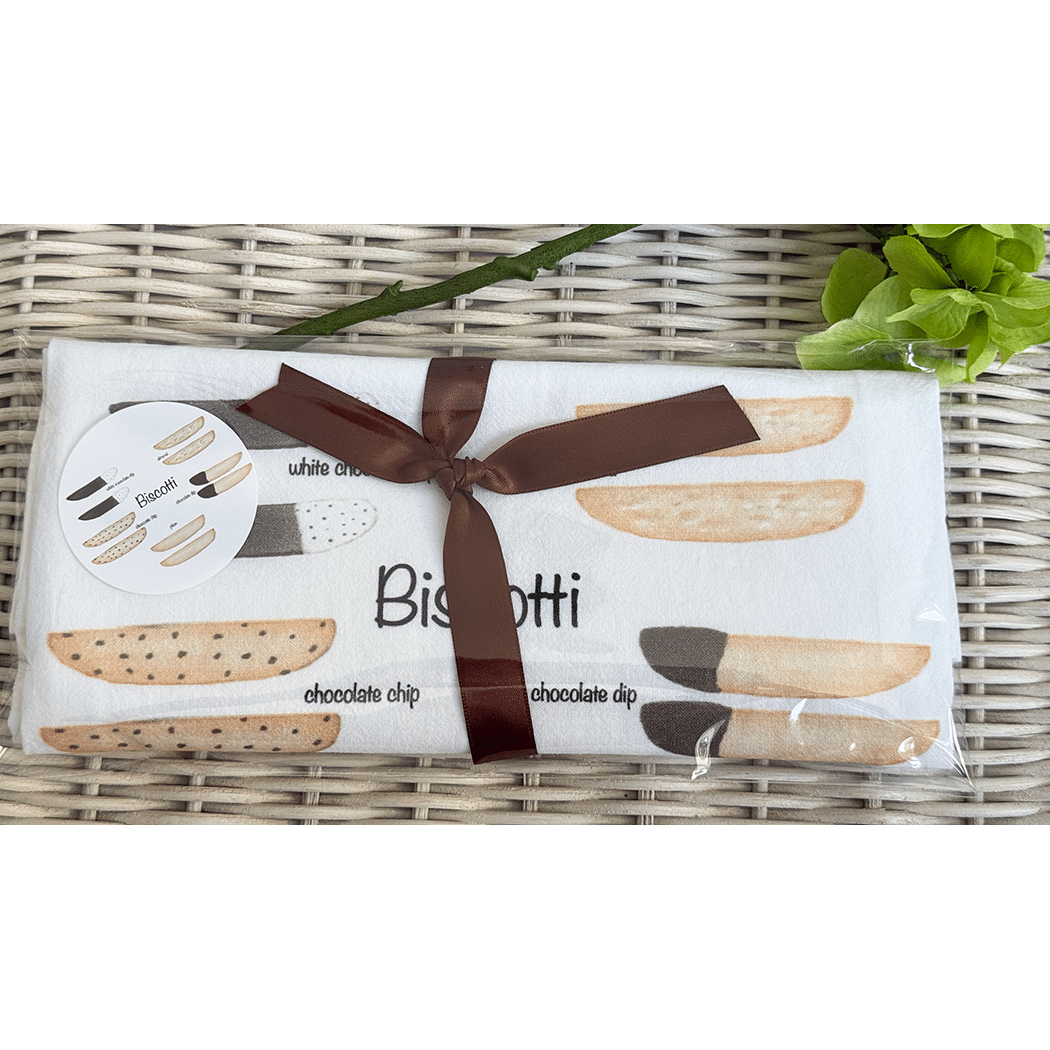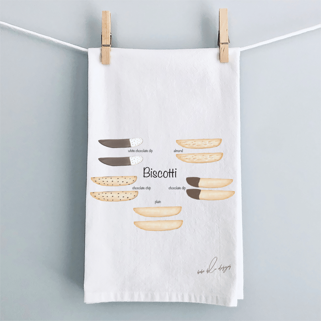 The Biscotti Flour Sack Tea Towel featuring: 2 Plain Biscotti, 2 Chocolate Dip Biscotti, 2 White Chocolate Dip Biscotti, 2 Almond Biscotti and 2 Chocolate Chip Biscotti. A perfect hostess gift! Flour Sack Tea Towels are the perfect sustainable gift, cotton, lint free, high absorbency, aesthetic appeal, eco-friendly, reusable, recyclable, a daily kitchen staple.