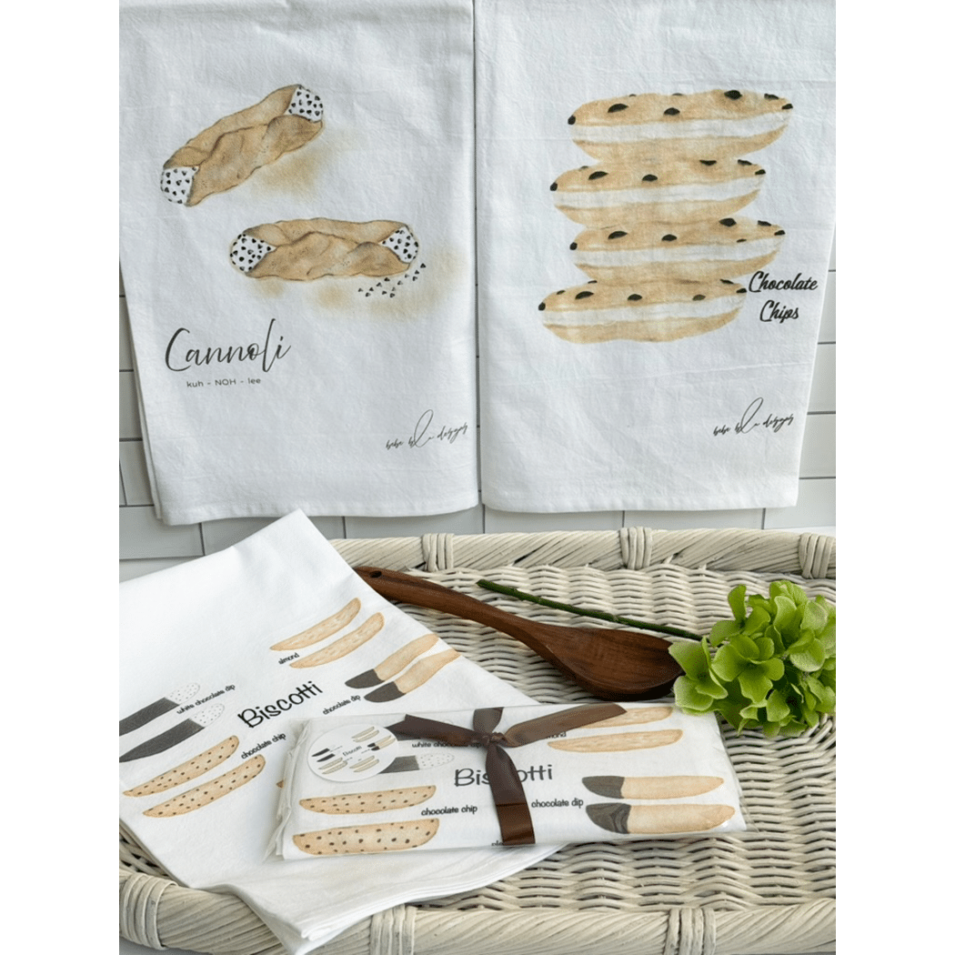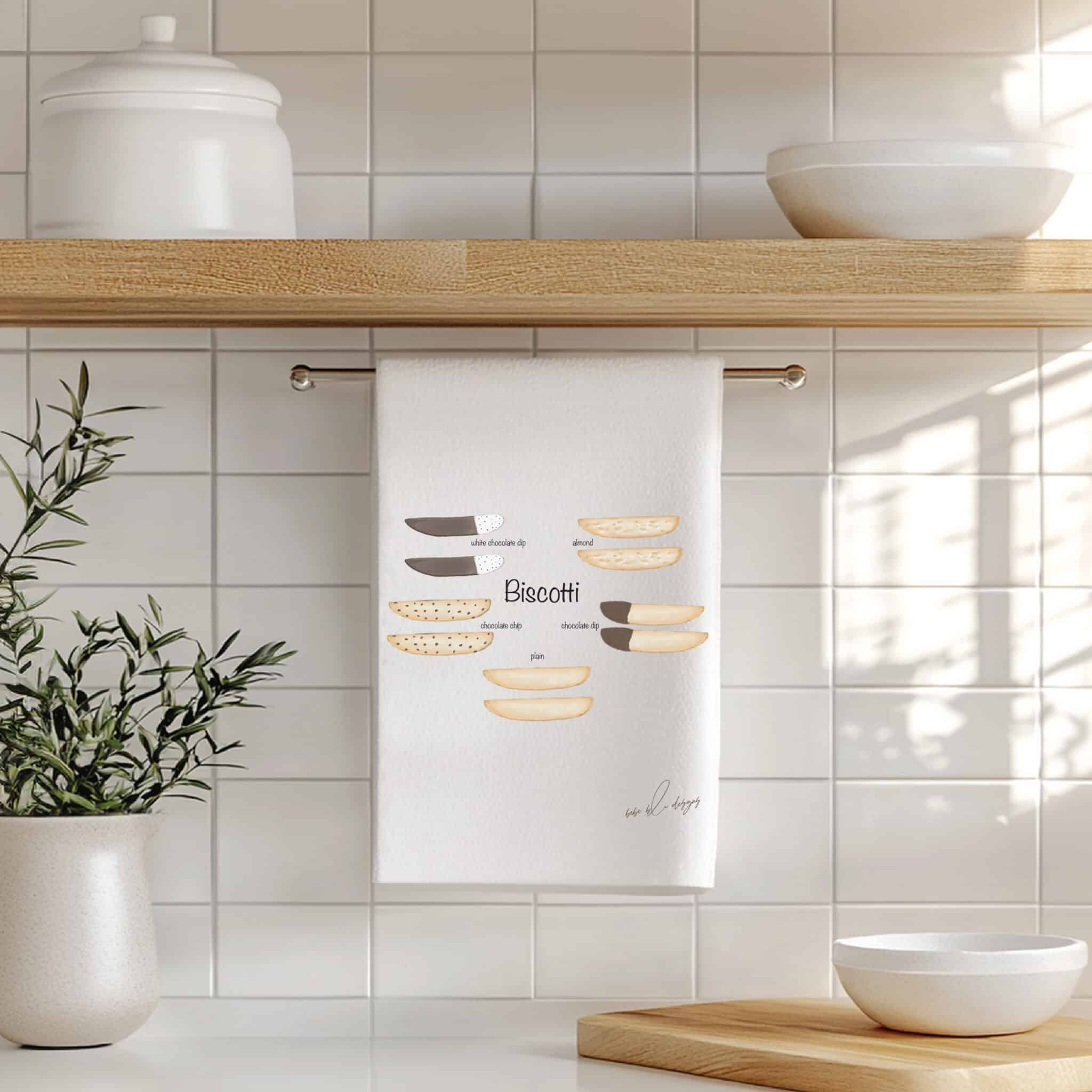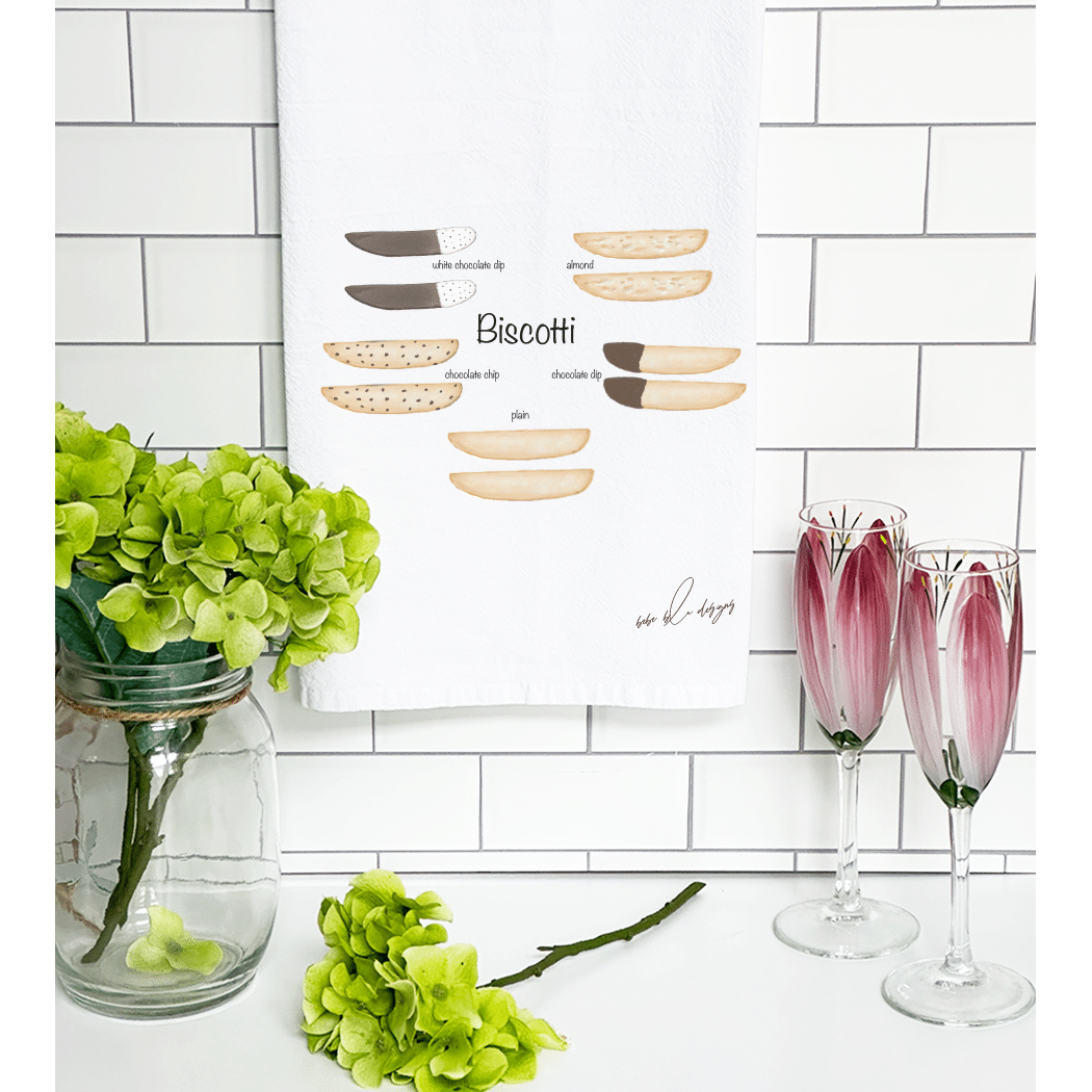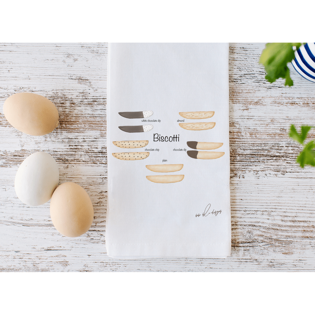 The Biscotti Flour Sack Tea Towel featuring: 2 Plain Biscotti, 2 Chocolate Dip Biscotti, 2 White Chocolate Dip Biscotti, 2 Almond Biscotti and 2 Chocolate Chip Biscotti. A perfect hostess gift! Flour Sack Tea Towels are the perfect sustainable gift, cotton, lint free, high absorbency, aesthetic appeal, eco-friendly, reusable, recyclable, a daily kitchen staple.
