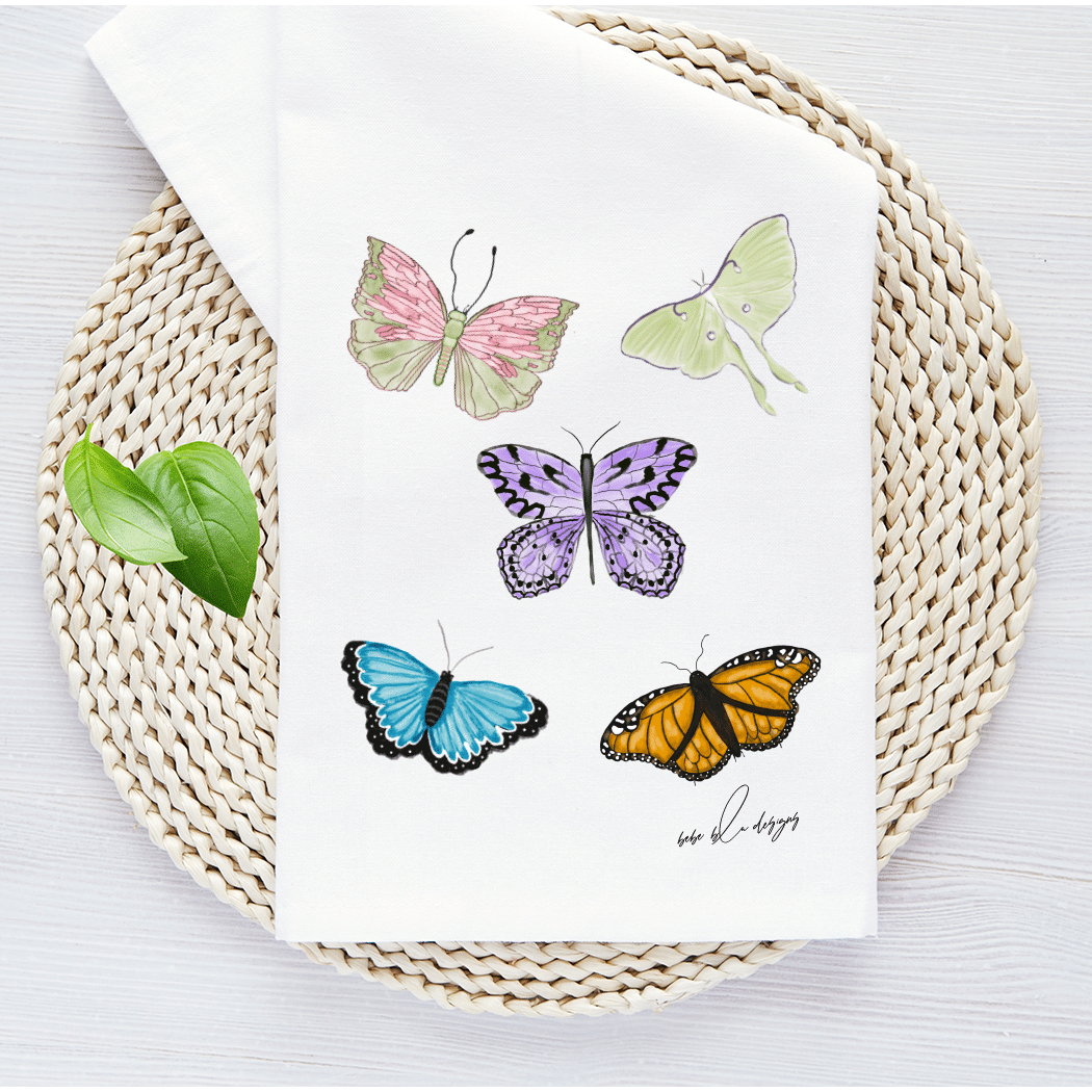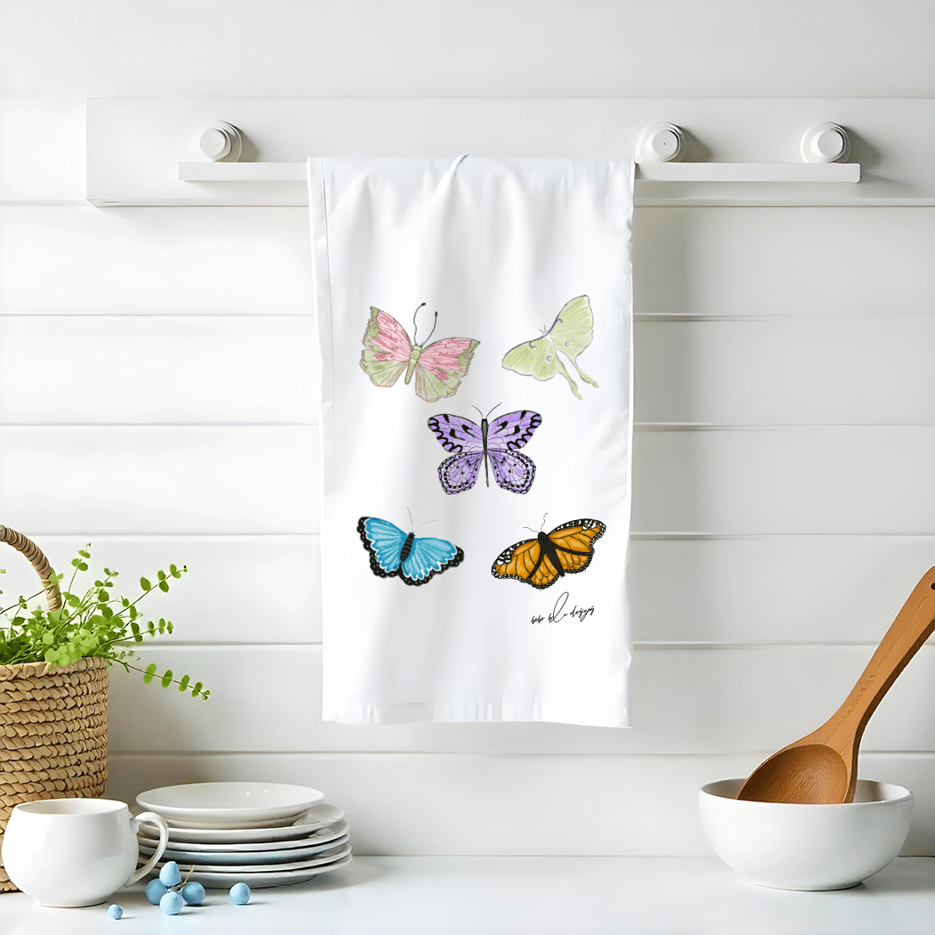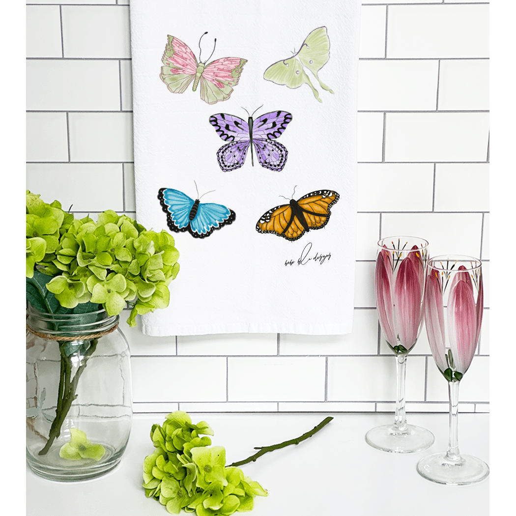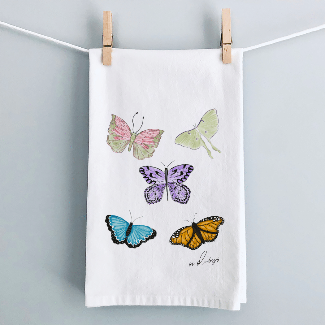 Colorful Butterflies on a Flour Sack Tea Towel. These beautiful butterflies and accompanied by at Luna Moth and makes for a wonderful a bright addition to any kitchen. A great hostess gift idea for any time of the year!
