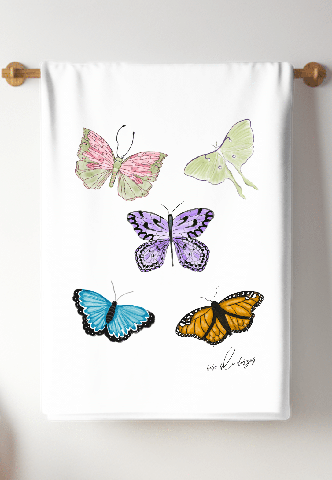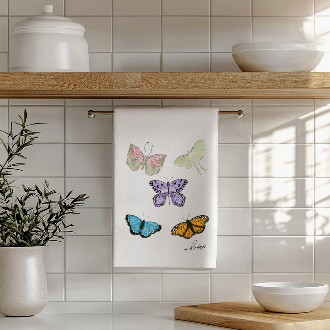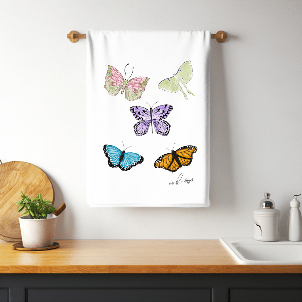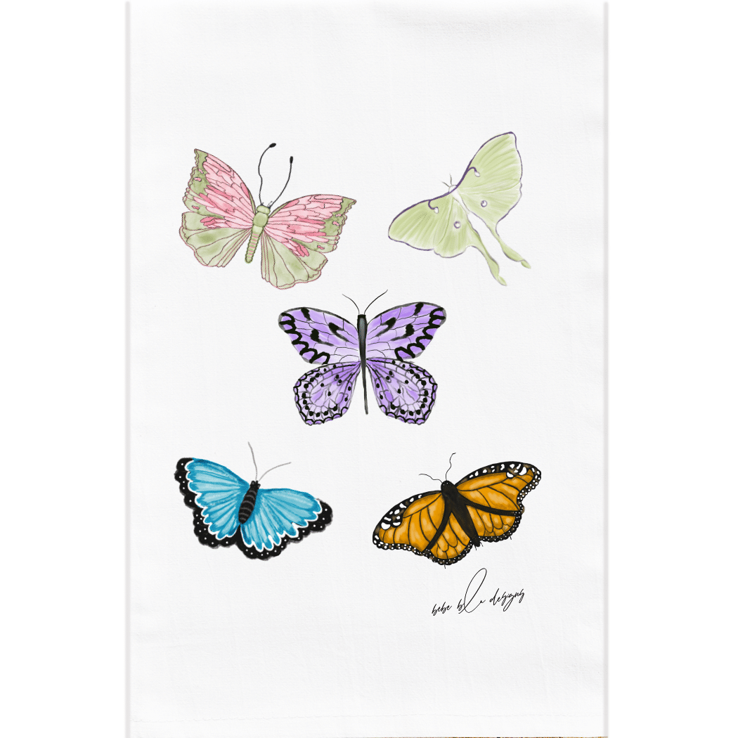 Colorful Butterflies on a Flour Sack Tea Towel. These beautiful butterflies and accompanied by at Luna Moth and makes for a wonderful a bright addition to any kitchen. A great hostess gift idea for any time of the year!