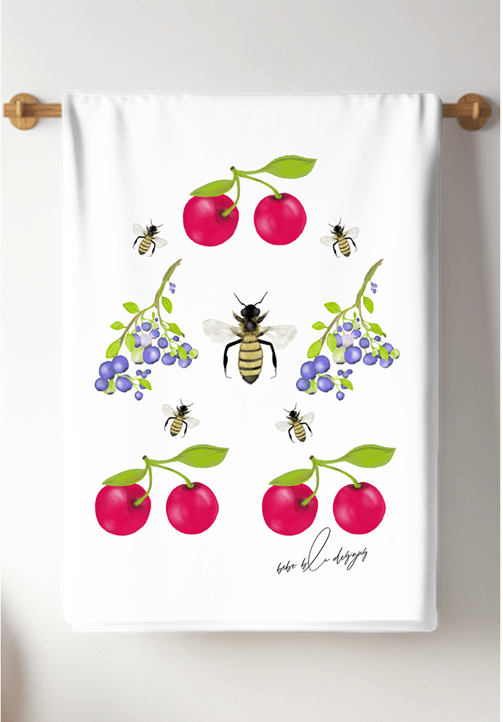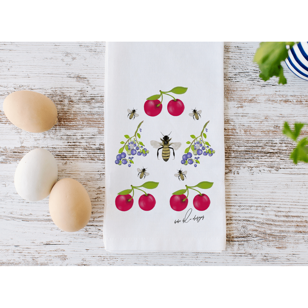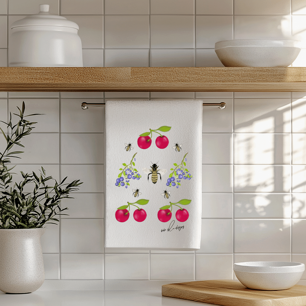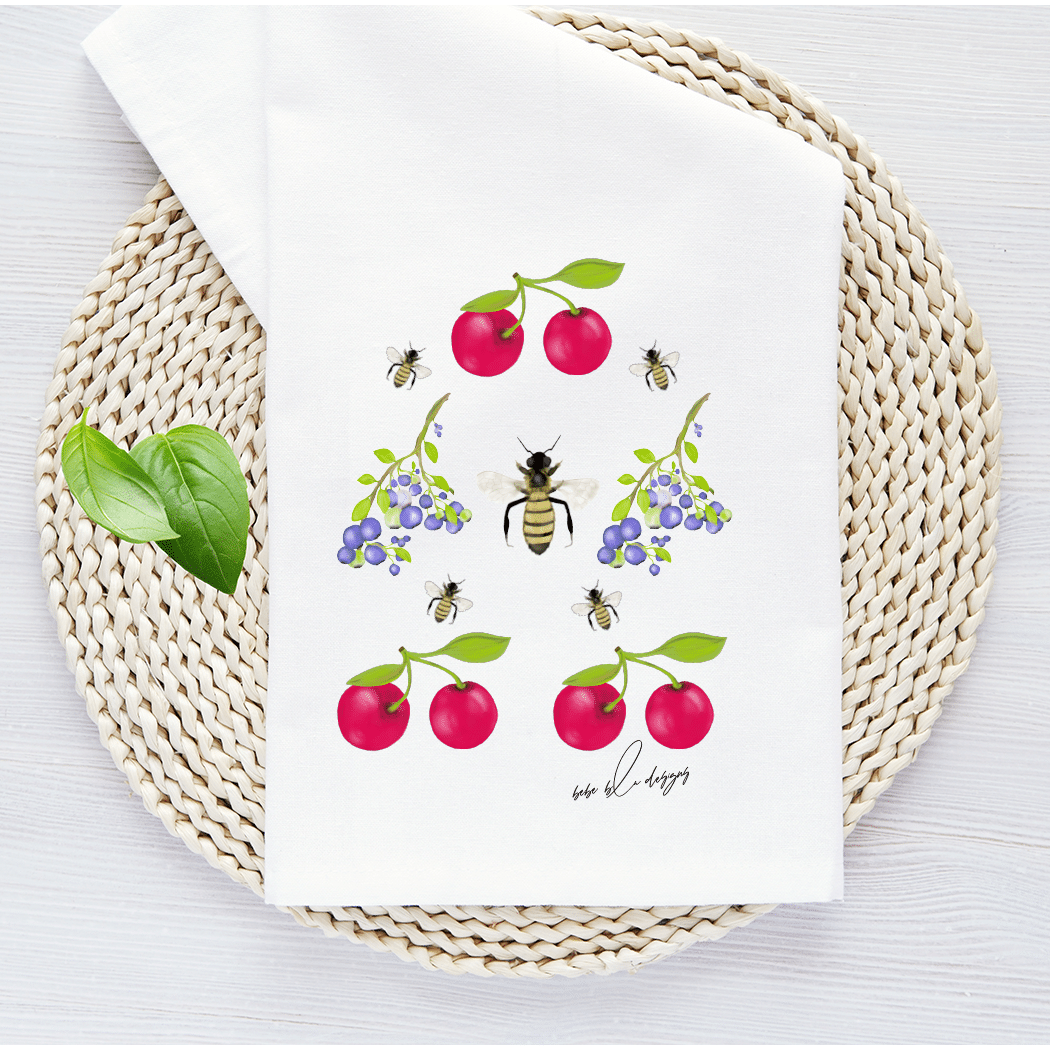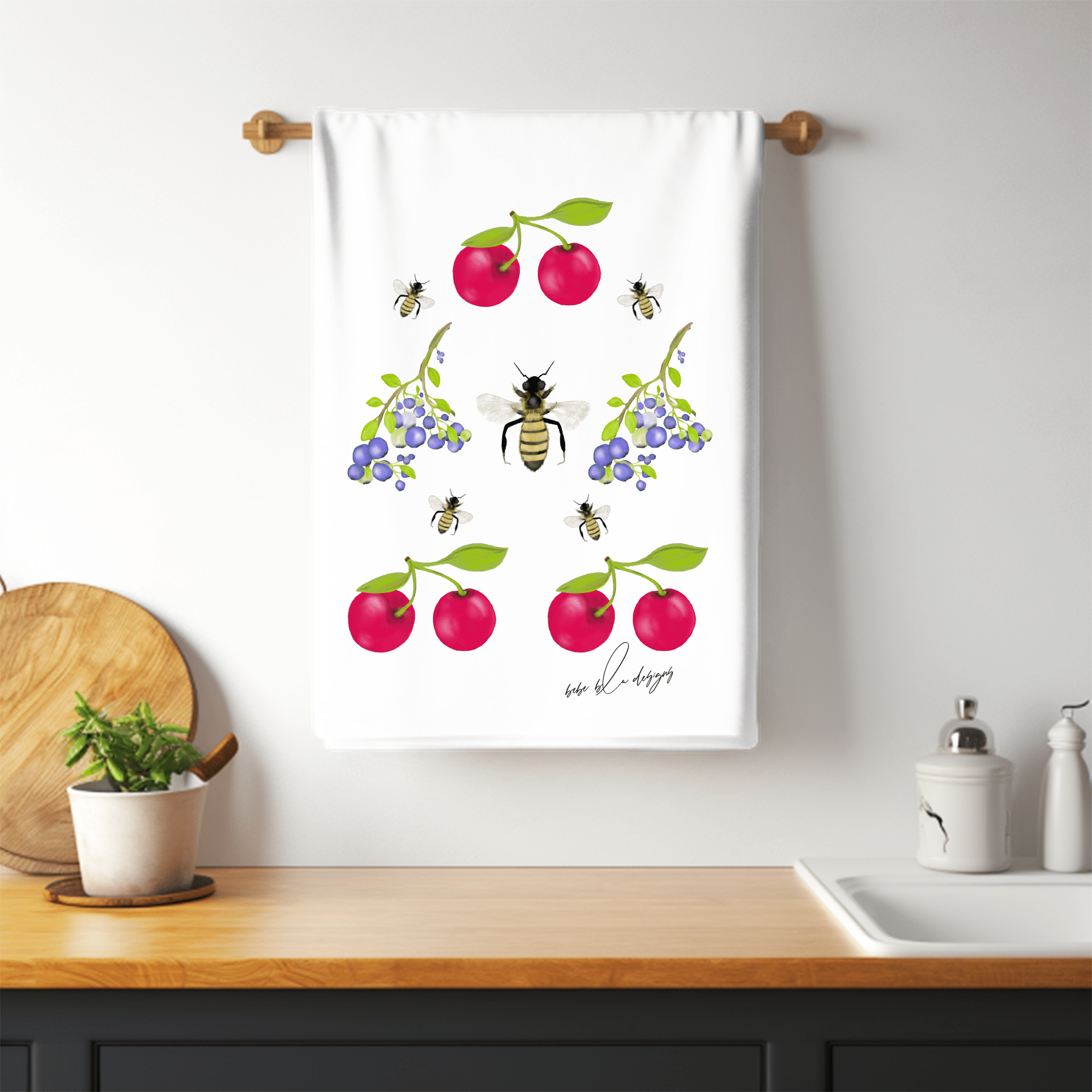 Cherries, Blueberries, and Bees Tea Towel, Flour Sack Towel
