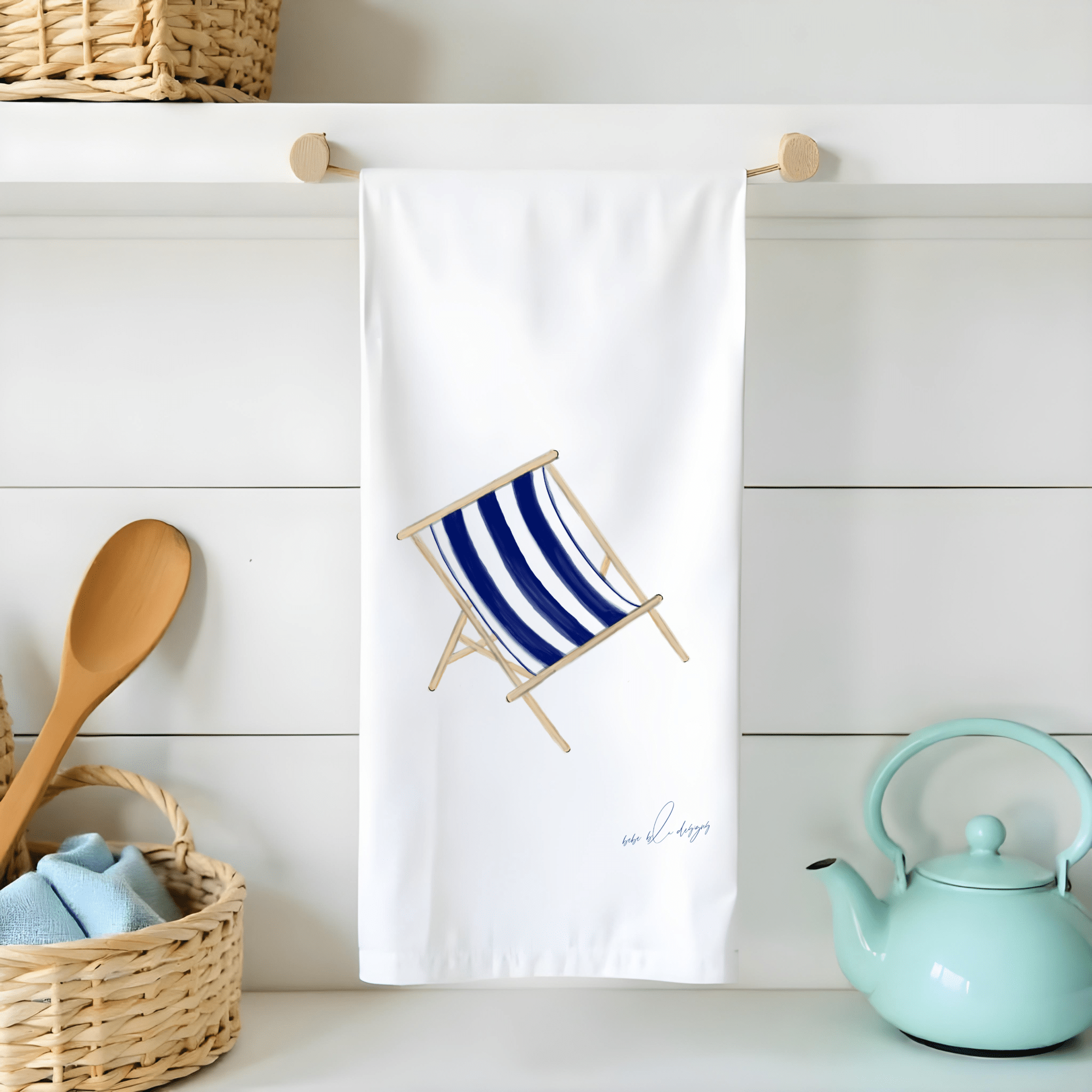 The Deck Chair Flour Sack Tea Towel features an adorable navy blue and white stripped deck chair making it a cute nautical theme gift. A great addition to your kitchen, especially during the summer month. Flour Sack Tea Towels are the perfect sustainable gift, cotton, lint free, high absorbency, aesthetic appeal, eco-friendly, reusable, recyclable, a daily kitchen staple.