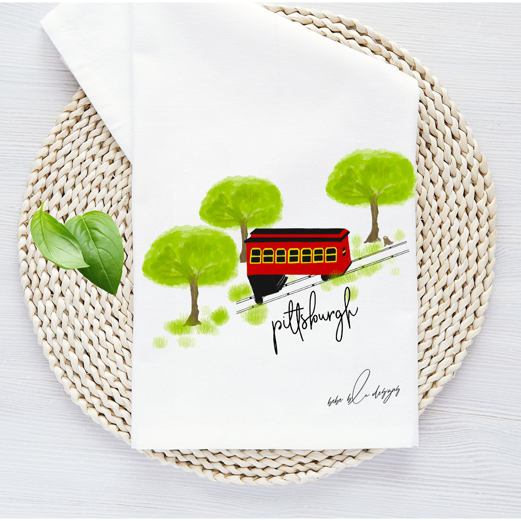 Flour Sack Towel designed with the Incline in Pittsburgh. The Incline Flour Sack towel is a perfect gift for anyone visiting Pittsburgh or who has ties to the city!