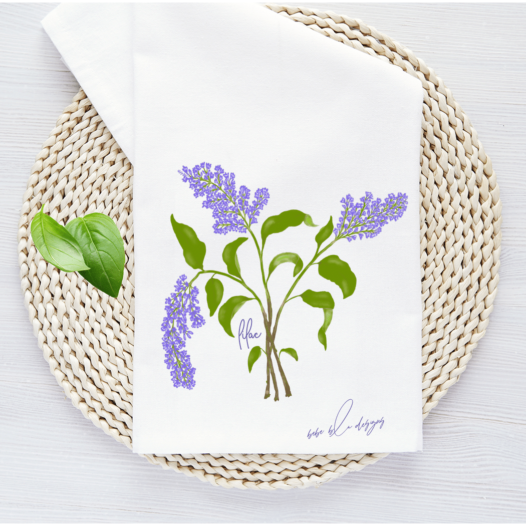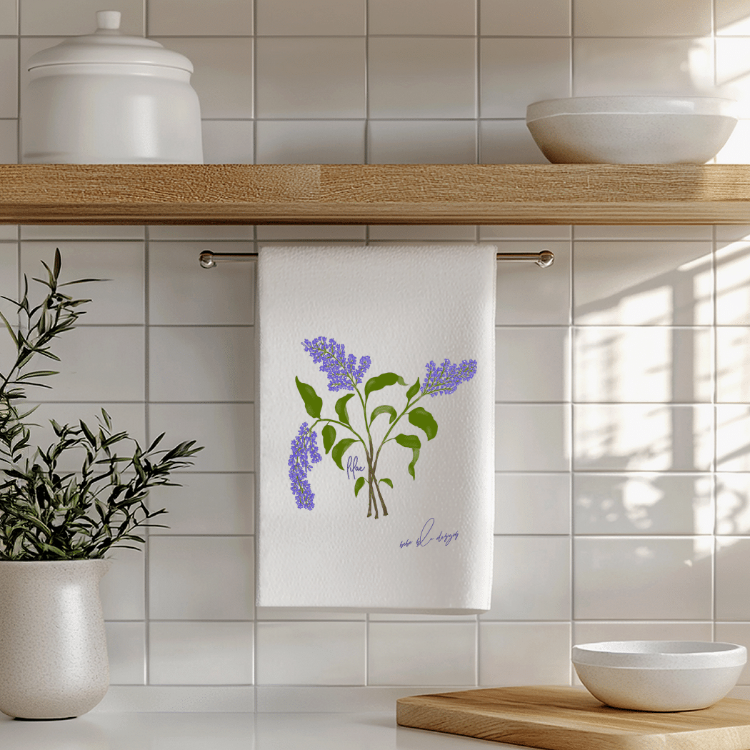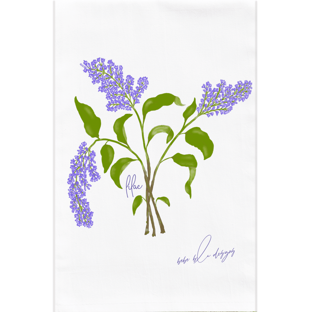 A Lilac designed Flour Sack Towel with three stems of purple lilacs. Lilacs have stood the test of time as a favorite flower among many.