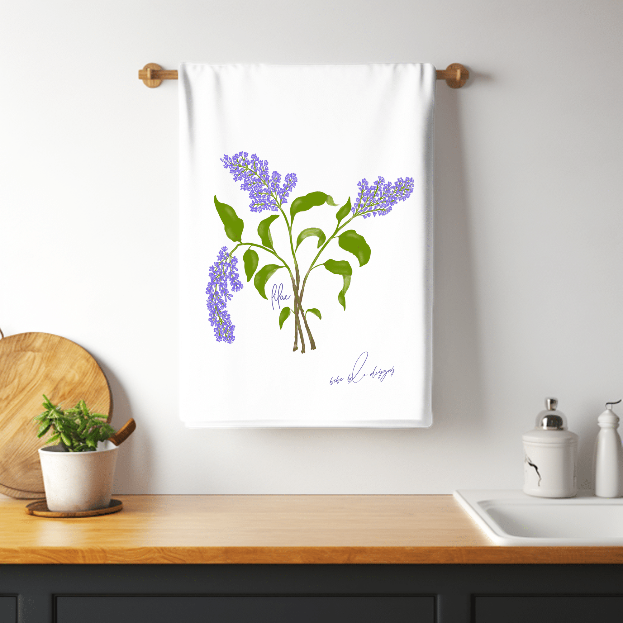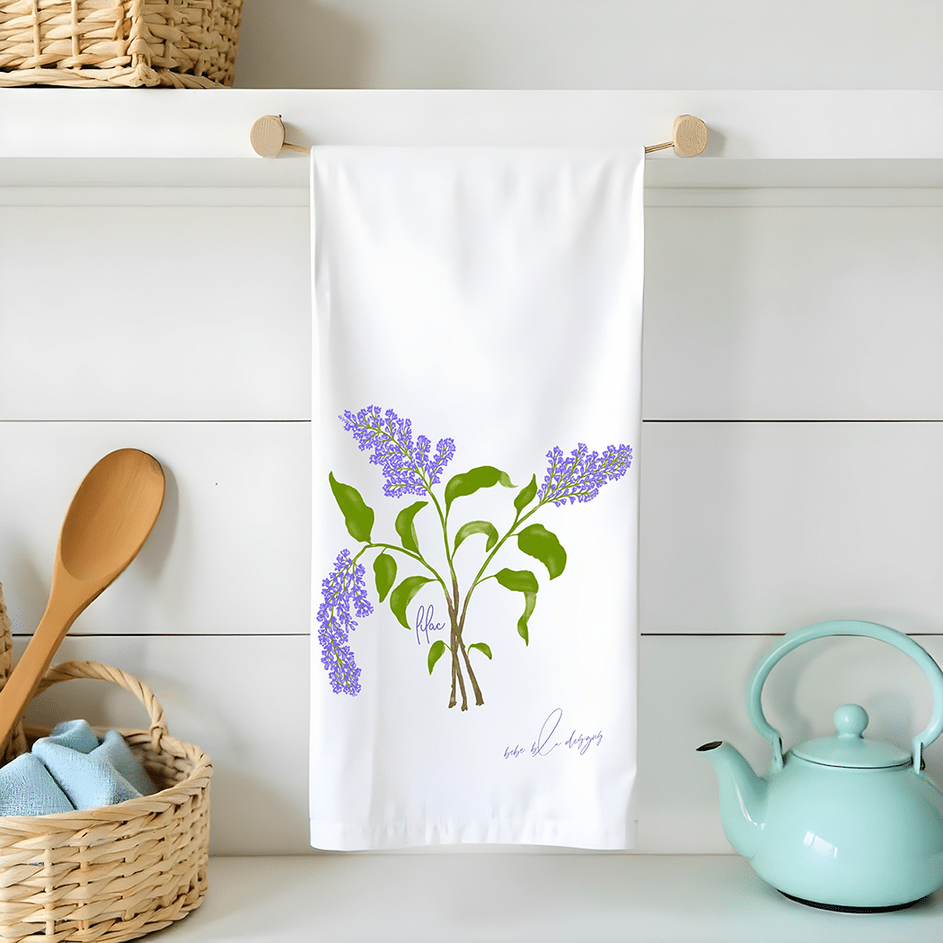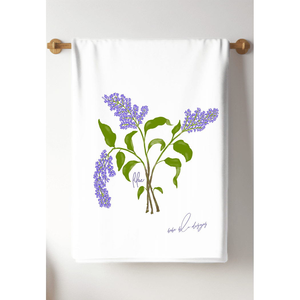 A Lilac designed Flour Sack Towel with three stems of purple lilacs. Lilacs have stood the test of time as a favorite flower among many.