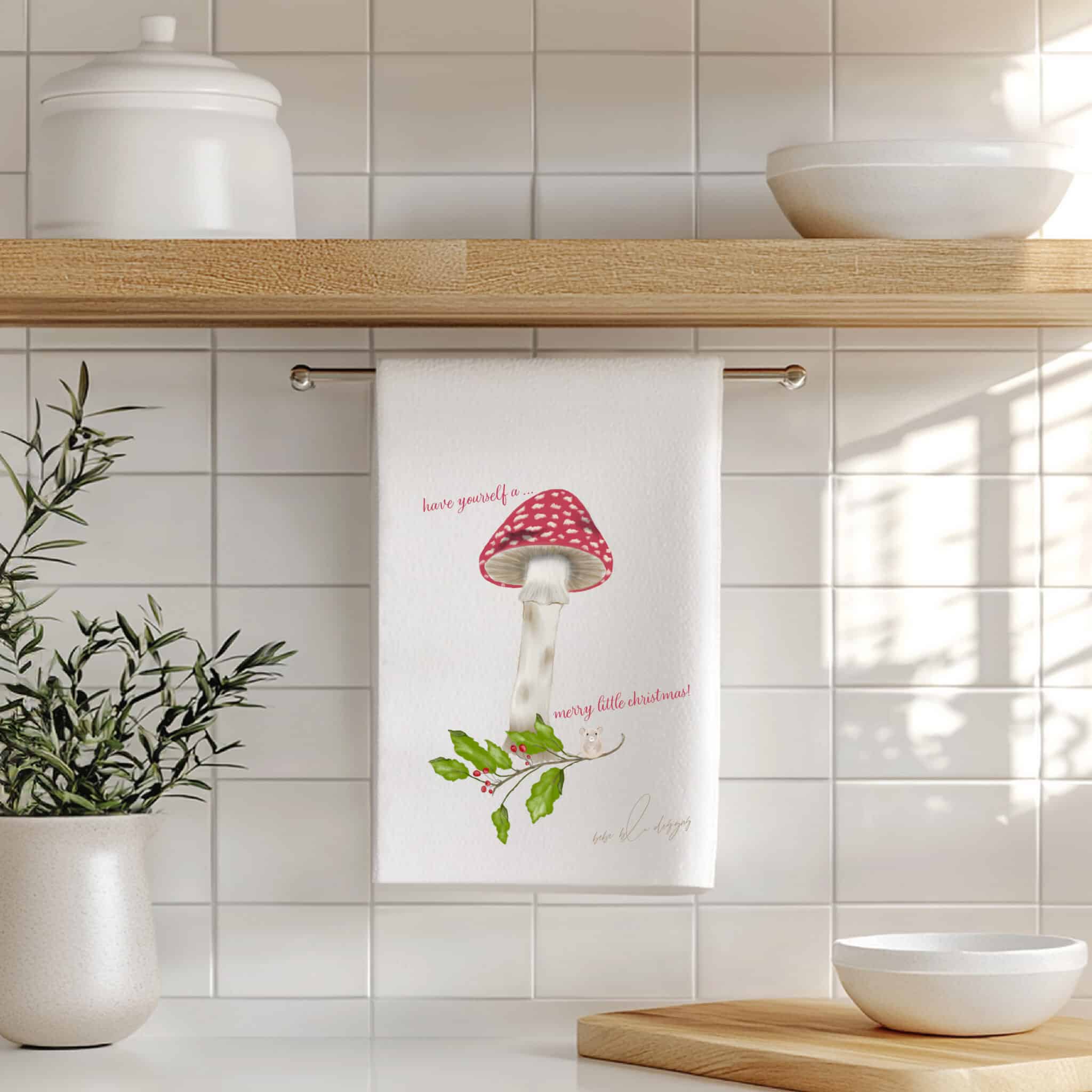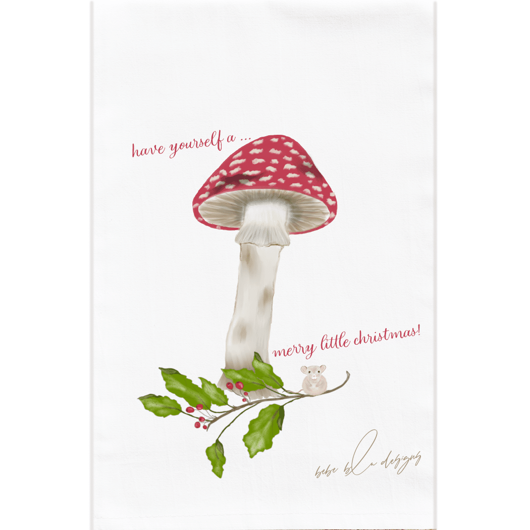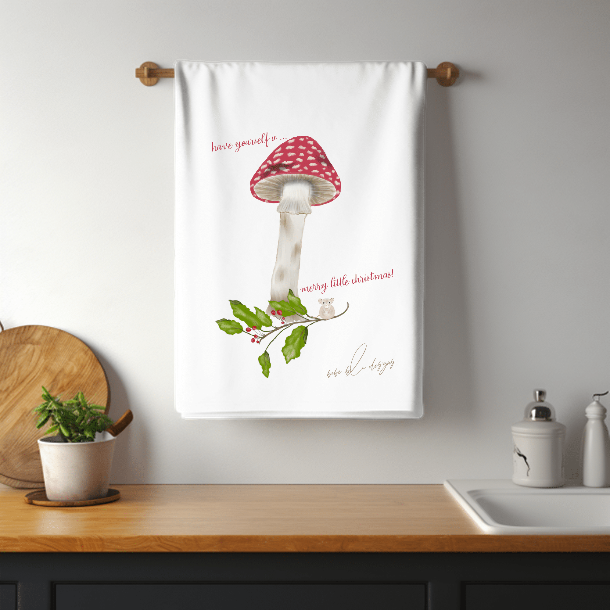 A fly agaric fungi is the backdrop for the minimalist design on Merry Little Christmas Flour Sack Towel.