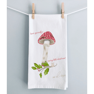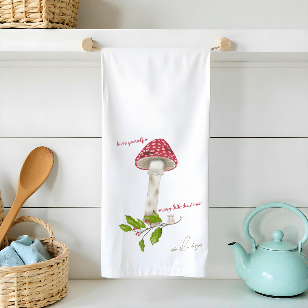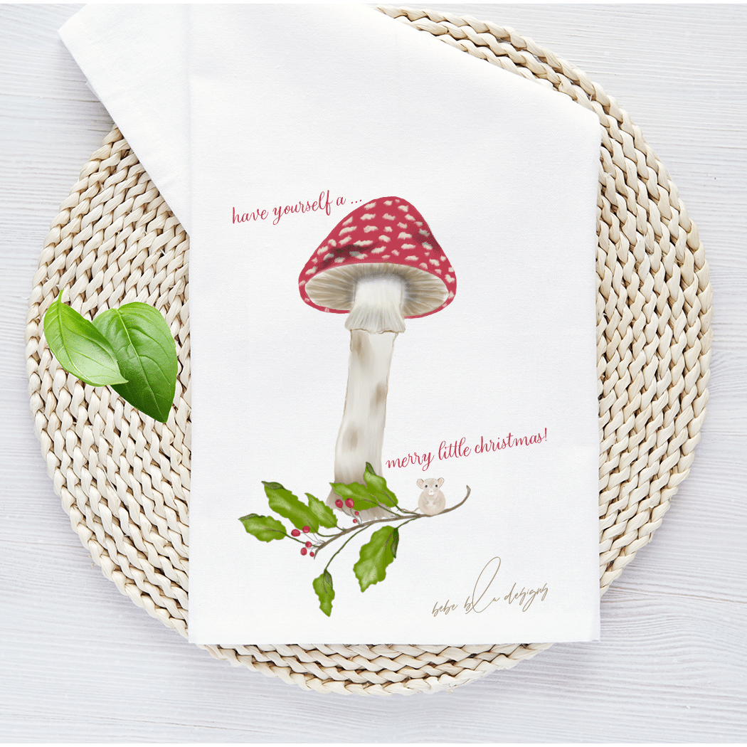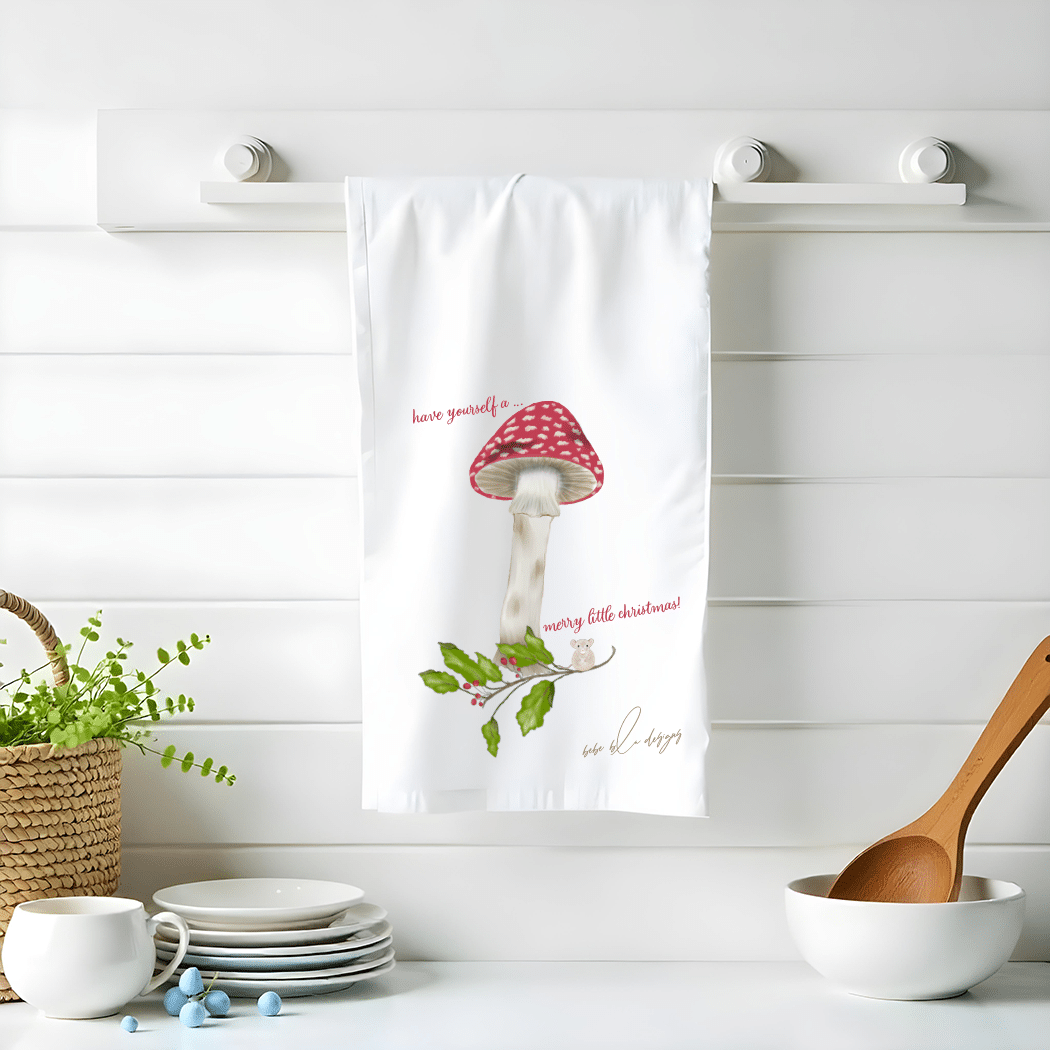 A fly agaric fungi is the backdrop for the minimalist design on Merry Little Christmas Flour Sack Towel.