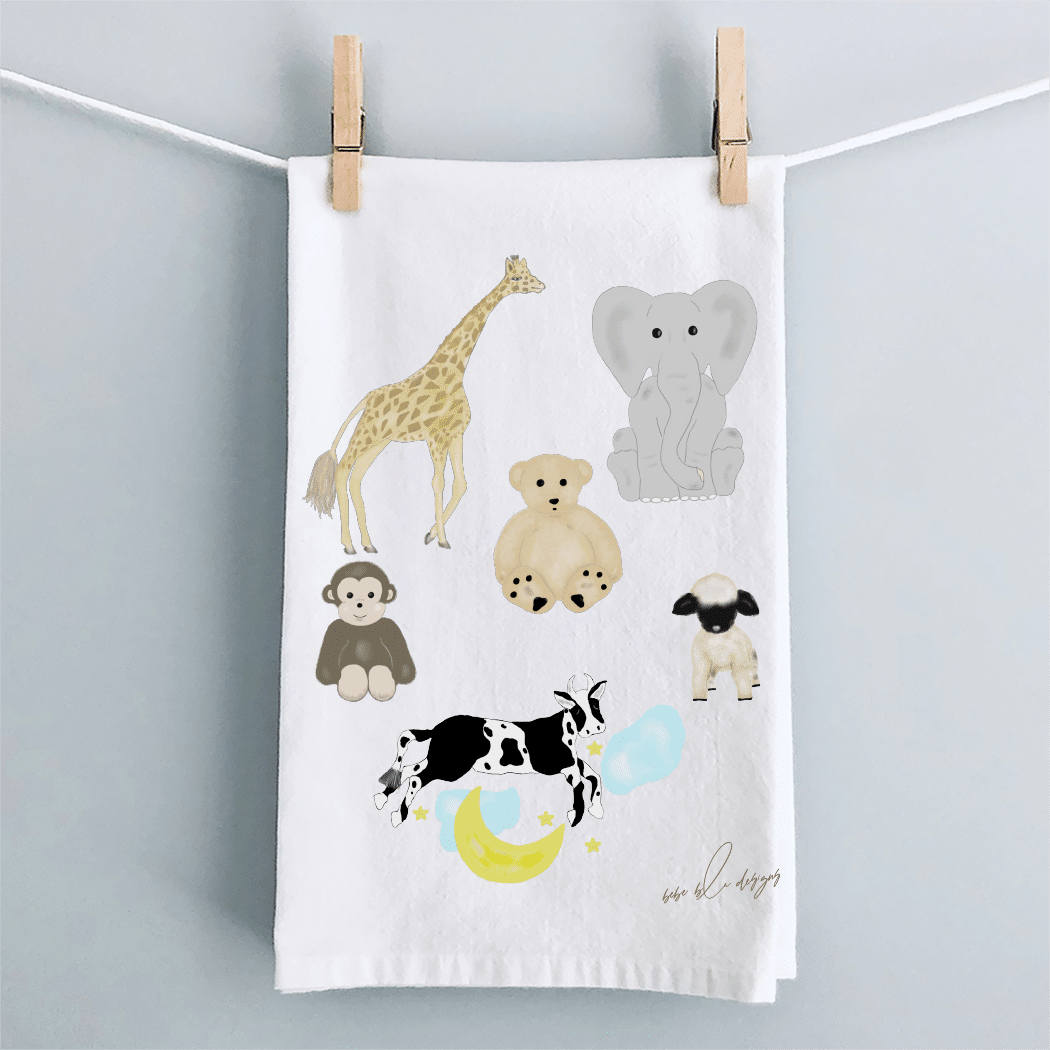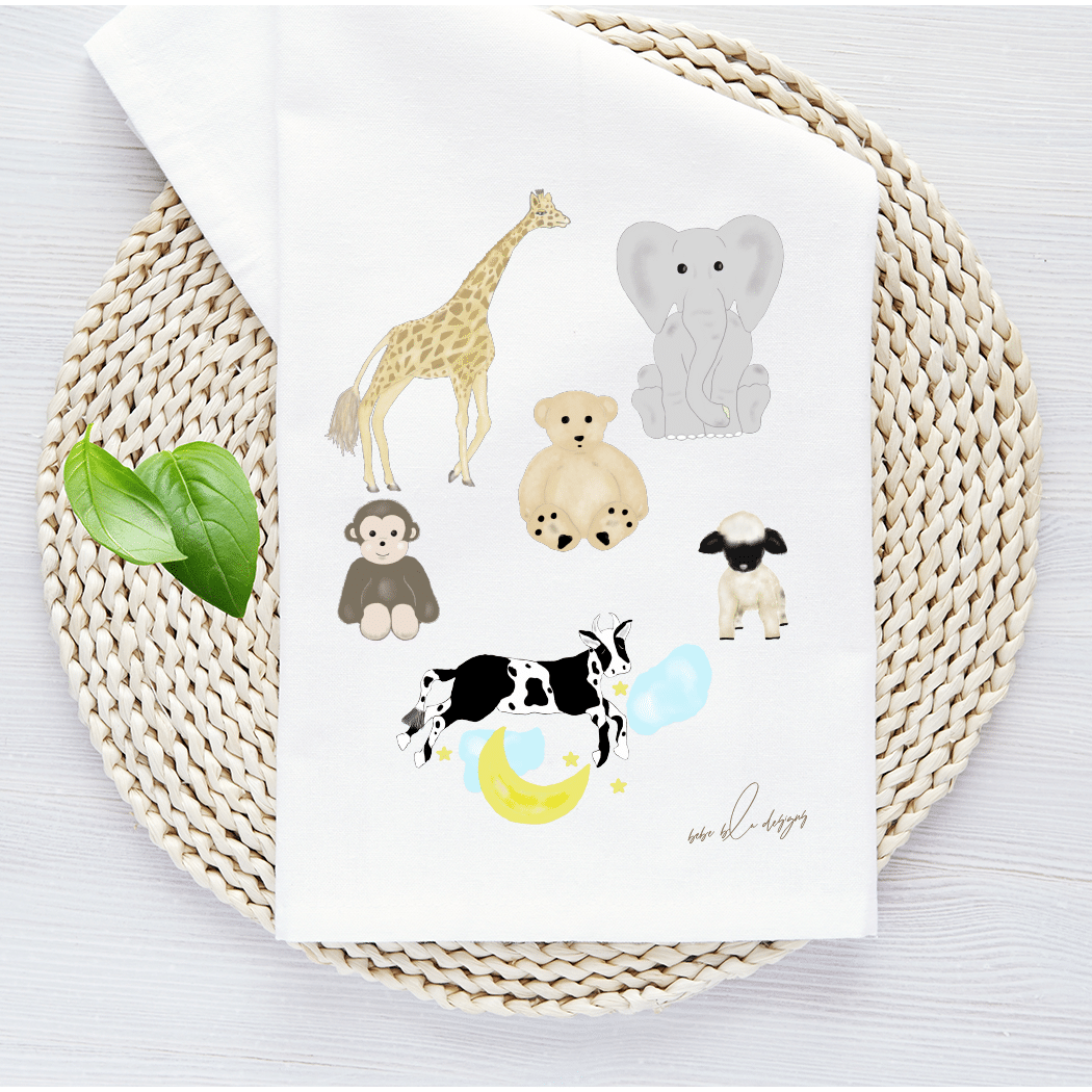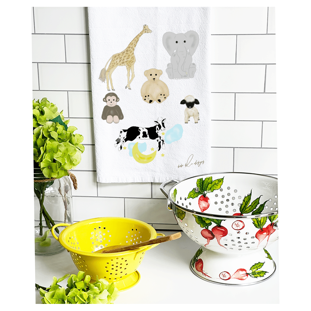 The Mothers Helper Flour Sack Tea Towel – a perfectly useful gift for any new parent. This 100% cotton, lint free towel can be a useful way to ‘clean up all baby messes!’ Its soft cotton material will make a great burb cloth or changing pad. Its ‘baby’ uses are endless! It features a giraffe, elephant, teddy bear, monkey, lamb and a cow jumping over the moon! Use the Mothers Helper towel to wrap a small baby gift for a new Mom, making it two gifts in one!