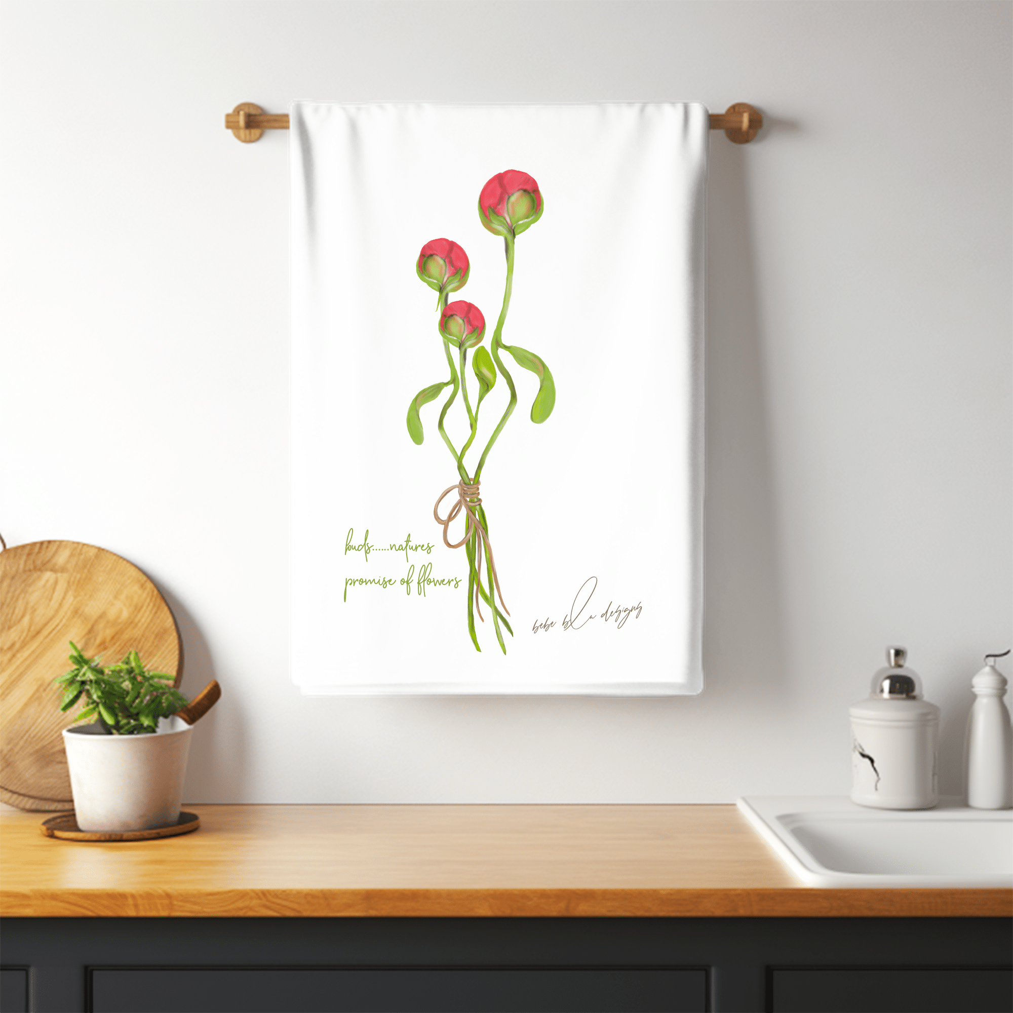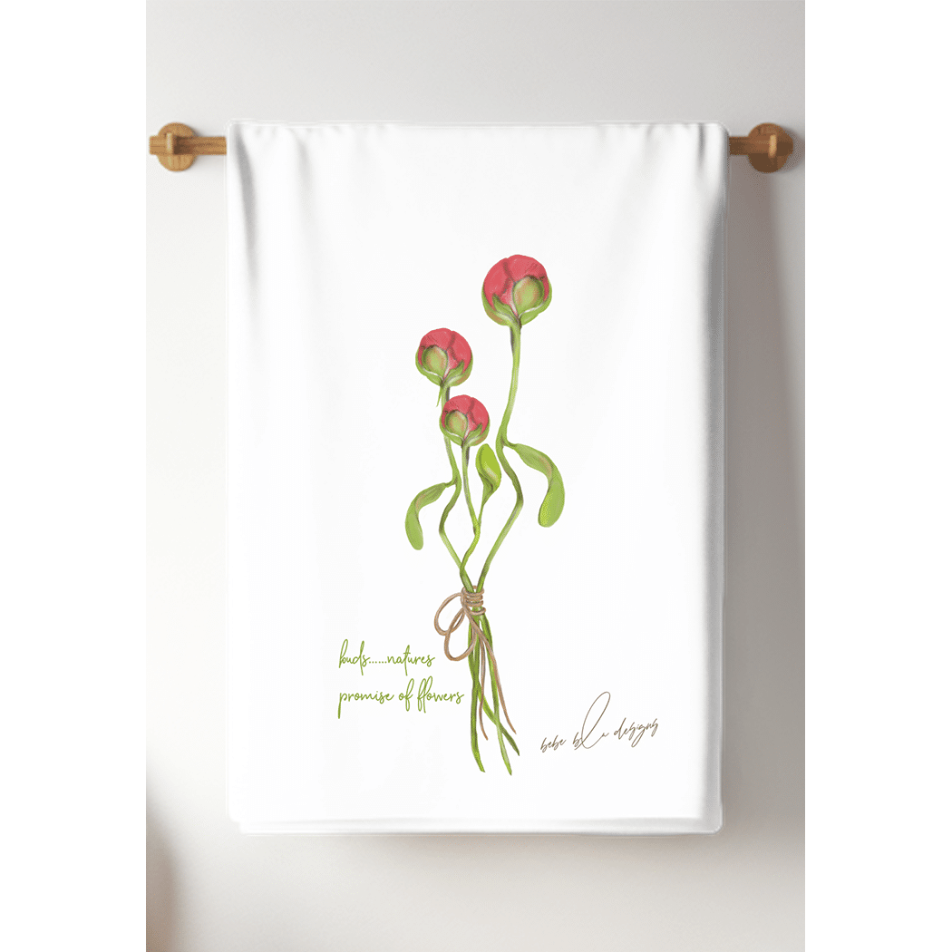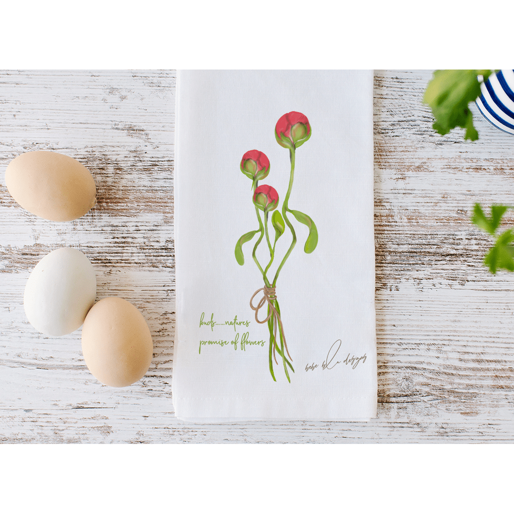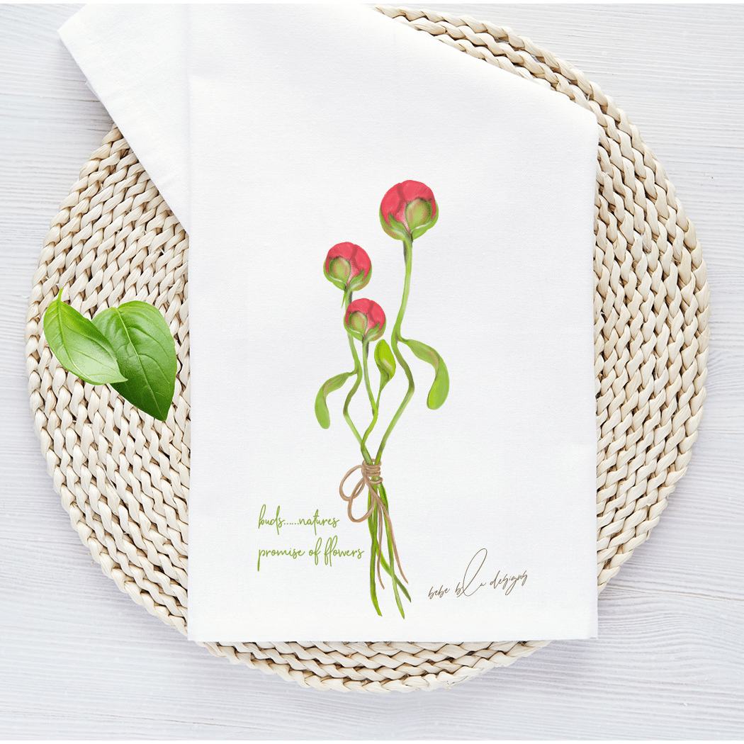 Peony Buds Flour Sack Towel features red peony buds tied together with twine and the saying ‘buds…natures promise of flowers!’