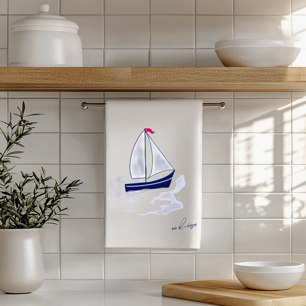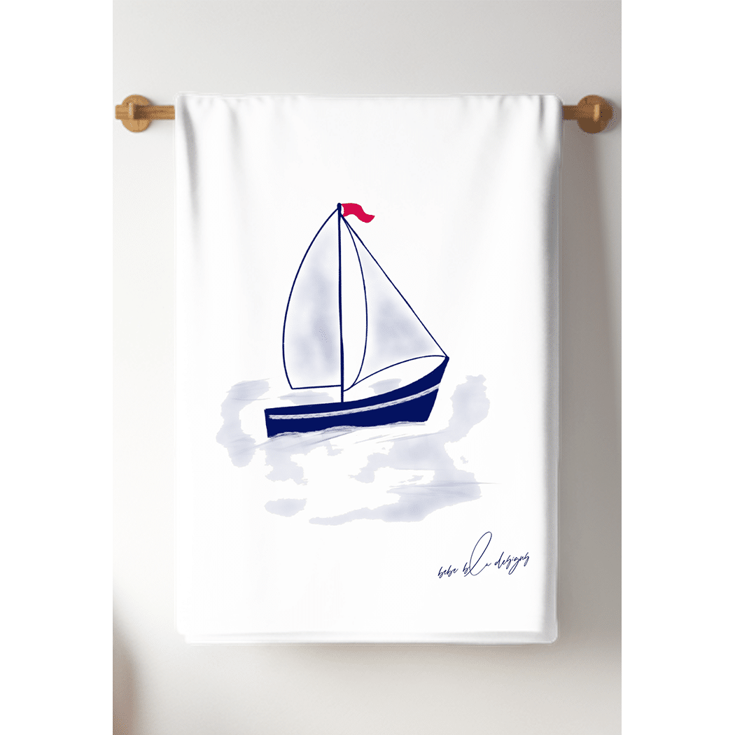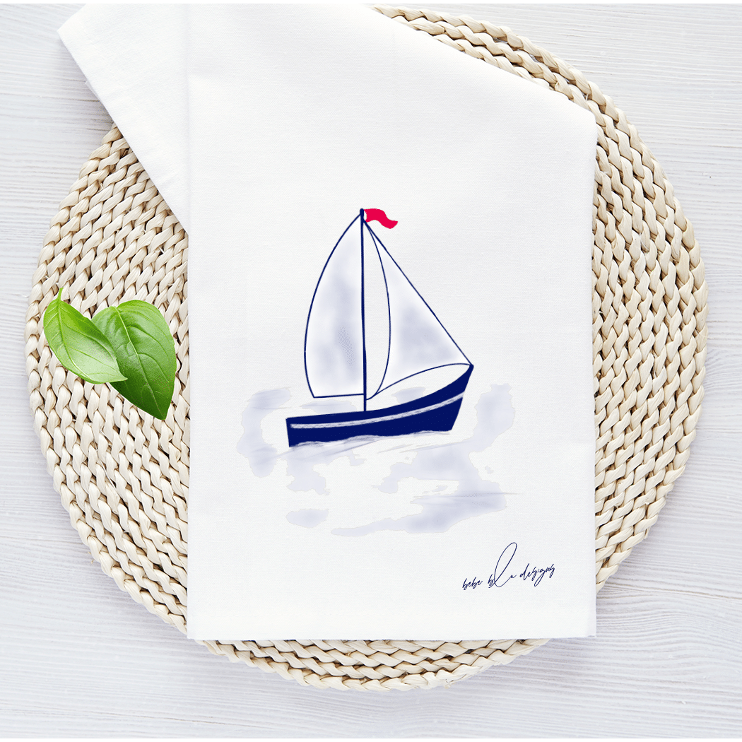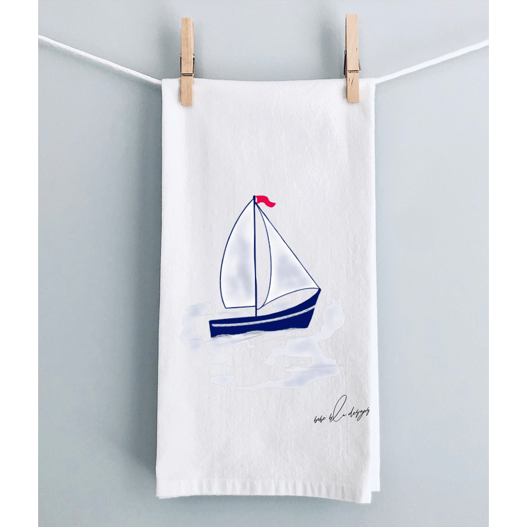 Sailboat Flour Sack Towel with a minimalist design of a Sailboat. A great lake house housewarming gift. A great nautical theme gift.