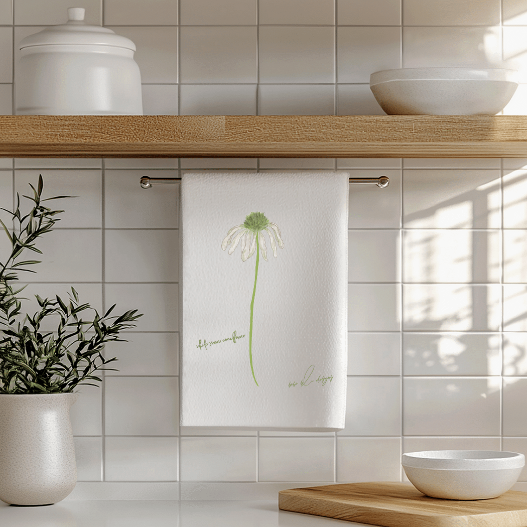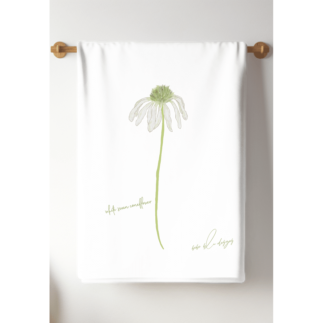 Soft and delicate, minimalist design of a White Swan Coneflower on a Flour Sack Towel. A simple yet elegant towel to use in kitchen or bath